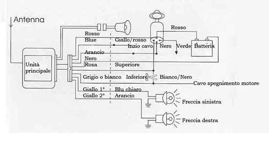 • Fare visionare lo schema elettrico (che trovate in questa pagina) dal vostro elettrauto di fiducia, prima di effettuare l'acquisto. Esistendo tante moto in commercio, è possibile che il sistema di iniezione della moto oppure qualora la moto fosse predisposta di chiavi con chip, alcune funzioni di questo allarme non potranno essere abilitate.
