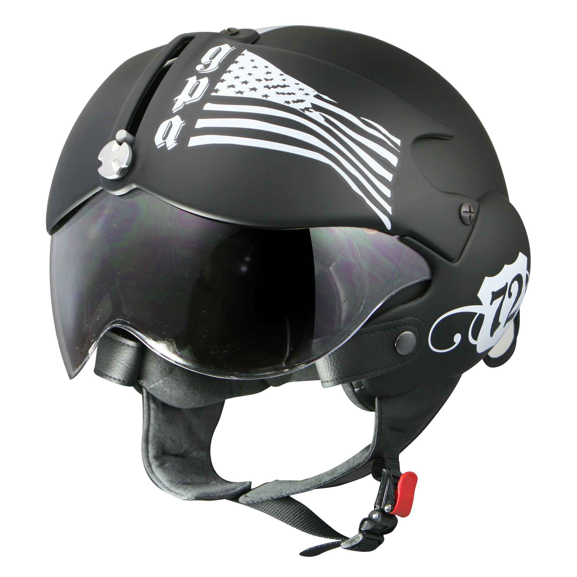 French manufacturer GPA have re-released a classic design in the Aircraft helmet. Previously known as the 'Osbe Tornado' (GPA having bought OSBE) it has distinct styling and an innovative visor system. The clear visor also has a retractable tinted visor behind it, a system unique to this helmet.