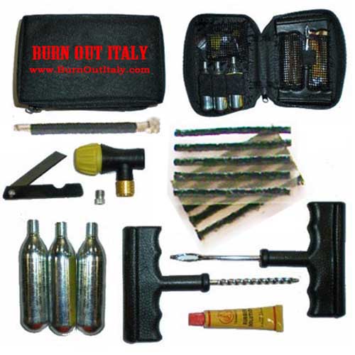 Come visibile in foto, il kit comprende 3 bombolette di CO2, taglierino, diverse guaine per tappare eventuale foro, mastice, regolatore di pressione da applicare alle bombolette di CO2, e due attrezzi indispispensabili per allargare eventuale foro ed inserire le guaine.